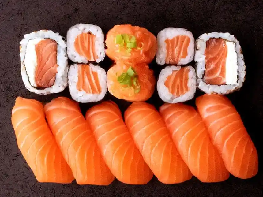 6 sushi salmão, 4 hossomaki salmão, 2 uramaki salmão com cream cheese e 2 jô salmão