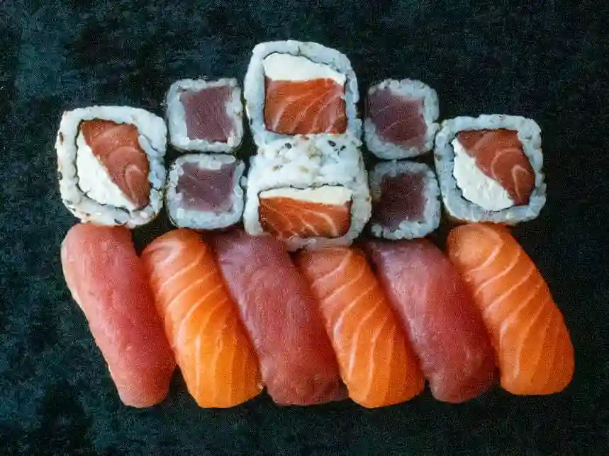 3 sushi atum, 3 sushi salmão, 4 tekkamaki, 4 uramaki salmão com cream cheese