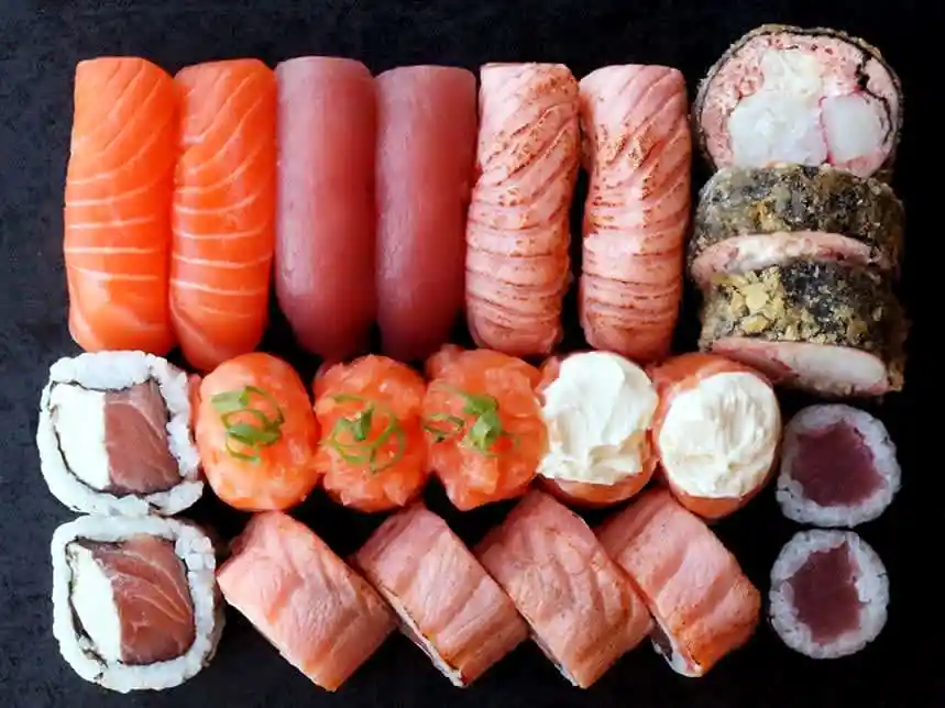 3 sushi atum, 3 sushi salmão, 4 tekkamaki, 4 uramaki salmão com cream cheese