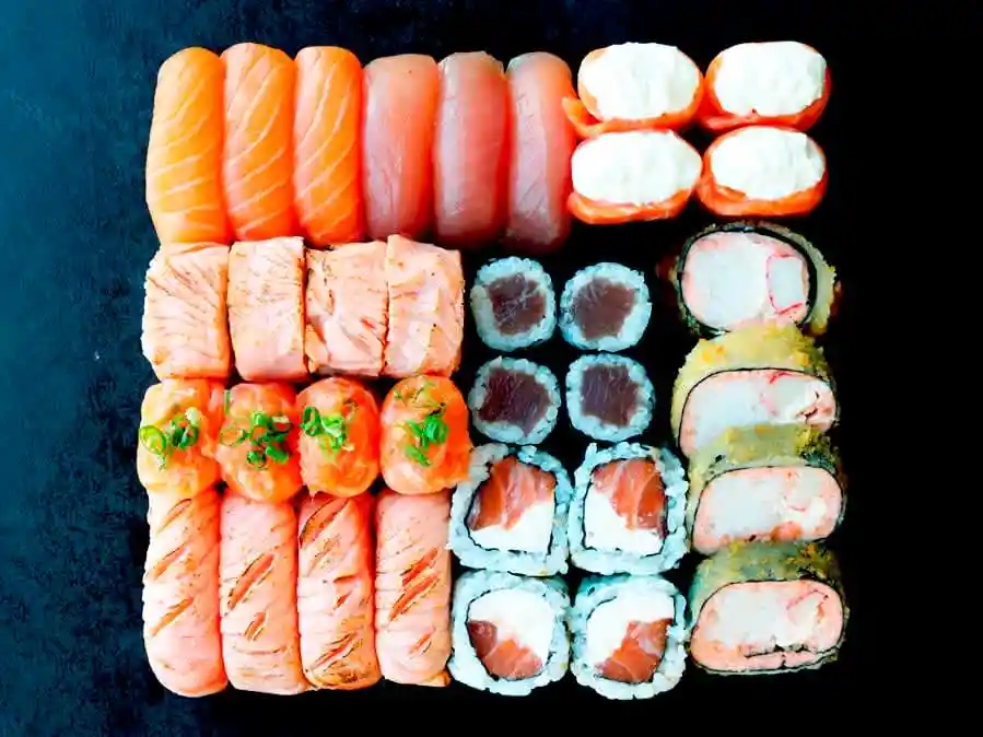 2 sushi salmão, 2 sushi atum, 2 sushi peixe branco, 1 sushi ebi, 1 sushi kani, 6 hossomaki salmão, 8 uramaki salmão com cream cheese.
