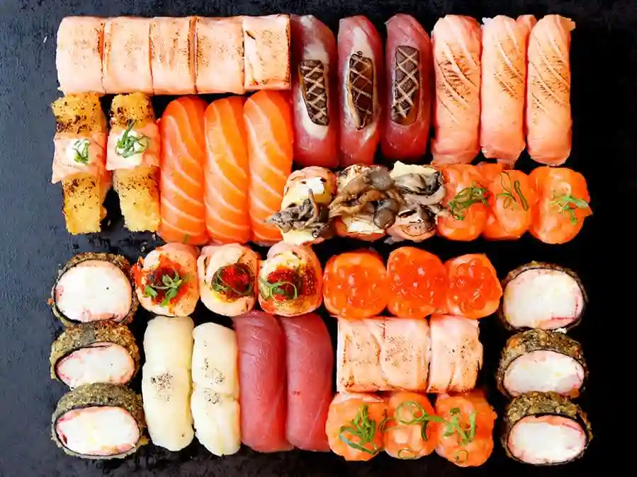 3 sushi salmão, 3 sushi atum, 4 uramaki salmão trufado, 4 jô salmão, 4 sushi salmão trufado, 4 uramaki salmão com cream cheese, 4 ayumi roll, 4 tekkamaki, 4 jô salmão com cream cheese