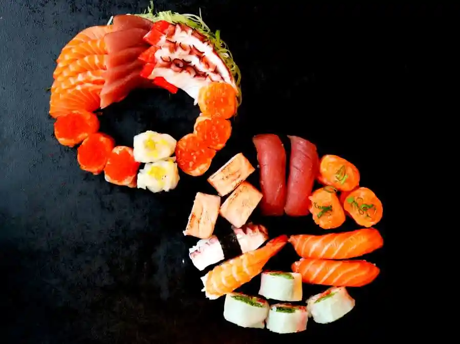 6 sushi salmão, 5 sushi atum, 4 sushi peixe branco, 3 sushi ebi, 3 sushi kani, 6 jô salmão, 6 jô shimeji, 4 hossomaki salmão, 4 hossomaki atum, 8 uramaki salmão com cream cheese, 8 rainbow roll, 4 califórnia