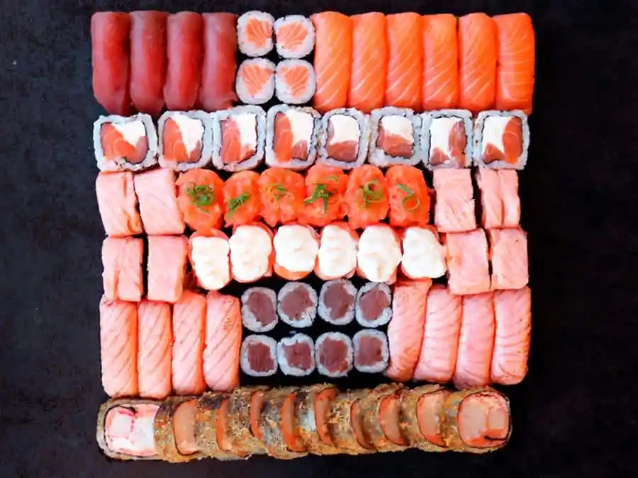 8 uramaki salmão, 6 sushi salmão, 10 ayumi roll, 8 uramaki califórnia, 4 uramaki salmão skin, 6 jô salmão, 4 uramaki salmão com cream cheese, 4 sushi atum, 8 shakemaki, 8 kappamaki, 5 jô salmão com cream cheese