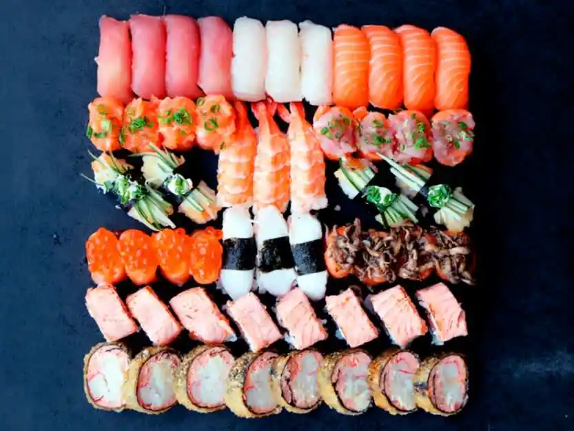 2 sushi salmão, 2 sushi atum, 2 sushi peixe branco, 1 sushi ebi, 1 sushi kani, 6 hossomaki salmão, 8 uramaki salmão com cream cheese.