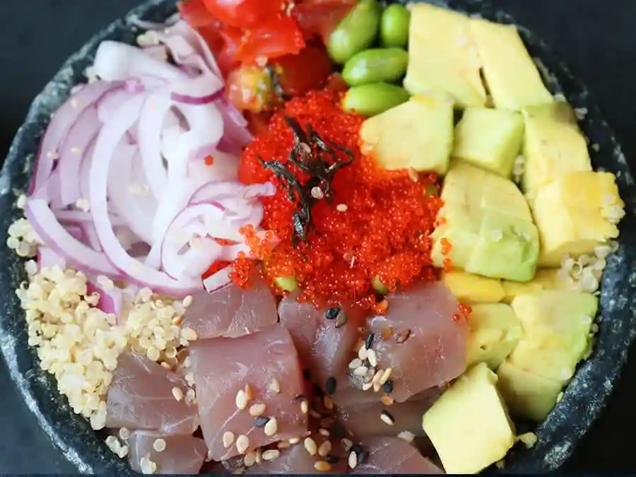 Base de quinoa com cubos de atum, gergelim, edamame, abacate, cebola roxa, tomates-cereja, quinoa, ovas de massagô e nori.