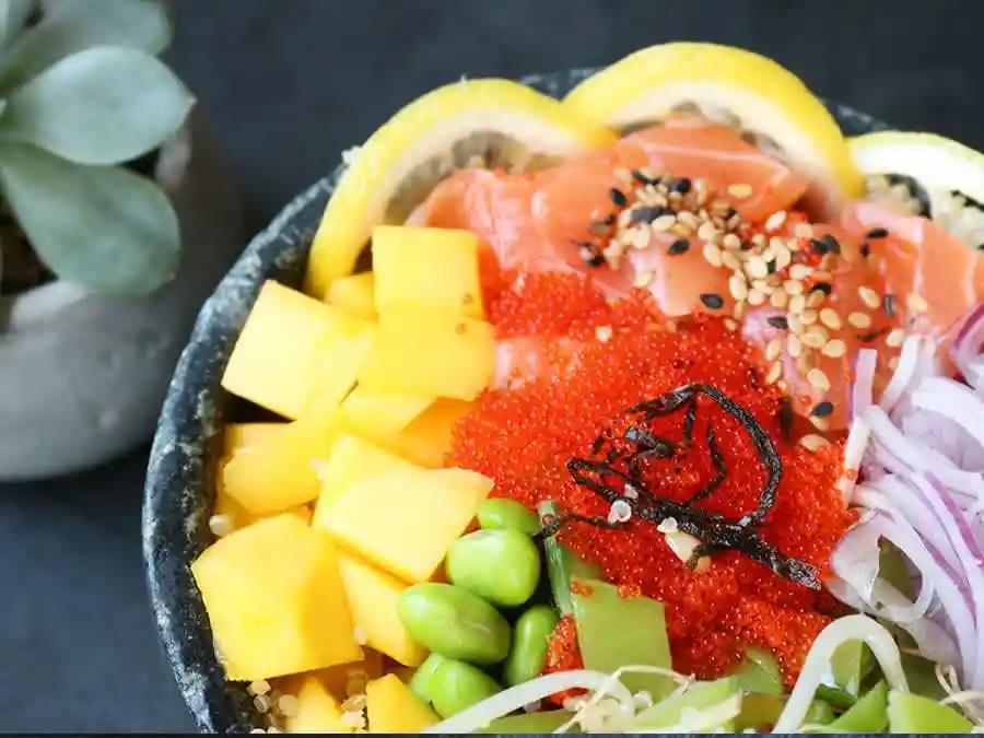 Base de quinoa com cubos de salmão, gergelim, edamame, manga, cebola roxa, salada de broto de feijão com ervilha torta, ovas de massagô e nori.