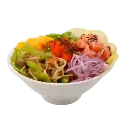 Base de shari integral com cubos de salmão, gergelim, edamame, manga, cebola roxa, salada de broto de feijão com ervilha torta, ovas de massagô e nori