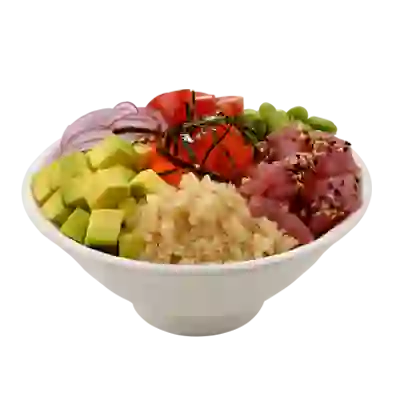 Base de quinoa com cubos de atum, gergelim, edamame, abacate, cebola roxa, tomates-cereja, quinoa, ovas de massagô e nori.