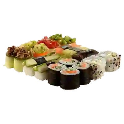2 jô de pepino com shimeji2 jô de pepino com tomate-cereja2 jô de cenoura com brócolis2 jô de cenoura com edamame2 sushi aspargos1 sushi cenoura1 sushi abacate1 sushi shitaque4 hossomaki de cenoura com pepino2 uramaki de abacate com aspargos e cream cheese