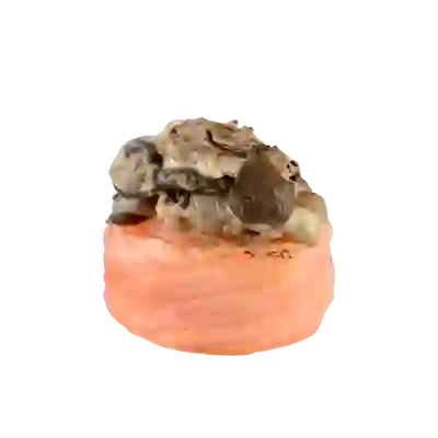 Uramaki crocante de salmão coberto com camarão e geléia de pimenta