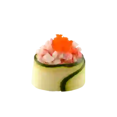 Arroz envolto por pepino e coberto com kani batido com maionese e ovas de massagô.