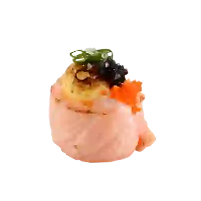 Enrolado de arroz com salmão coberto com gema de ovo de codorna brulé com top de massagô e fungui trufado