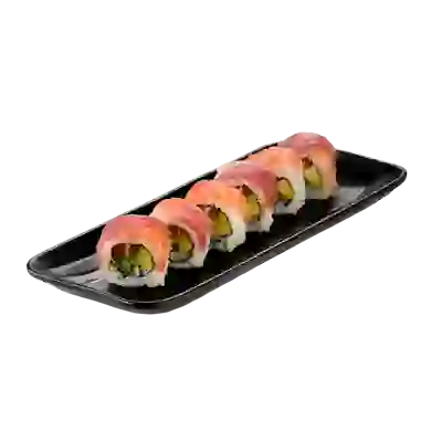 Uramaki de salmão com pepino e abacate, coberto com salmão, atum e peixe branco